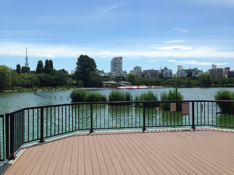 不忍池、近年新設された桟橋よりスカイツリーを望む